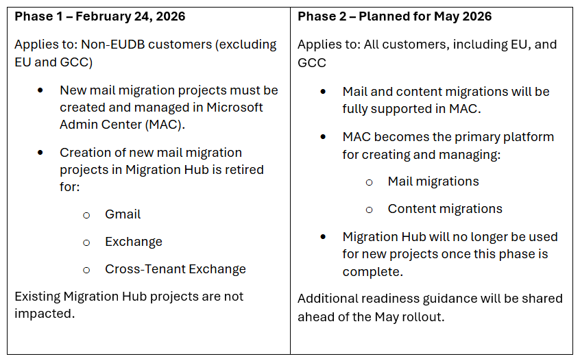 - Mail migrations are live in MAC for nonEU Data Boundary (nonEUDB) customers starting February 24, 2026; EU and GCC will follow in a later phase.