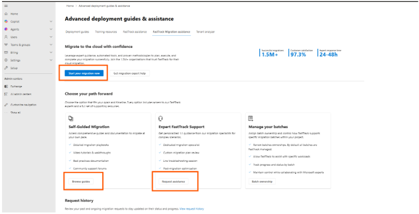 - Simple onboarding: In MAC, customers grant consent to FastTrack by selecting Start your migration now on the Advance Deployment and Assistance page under Setup.